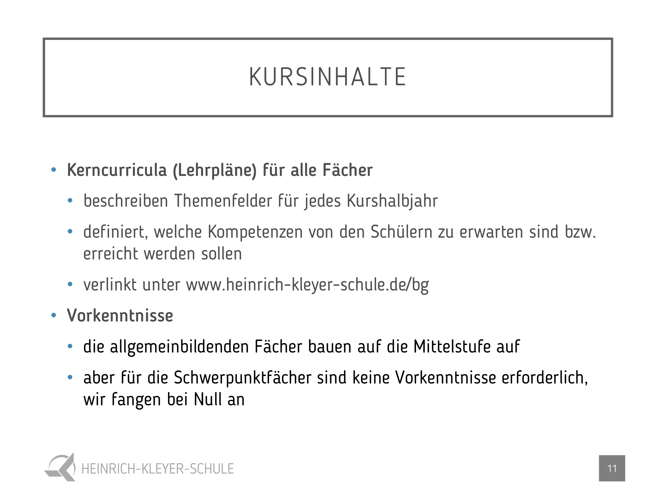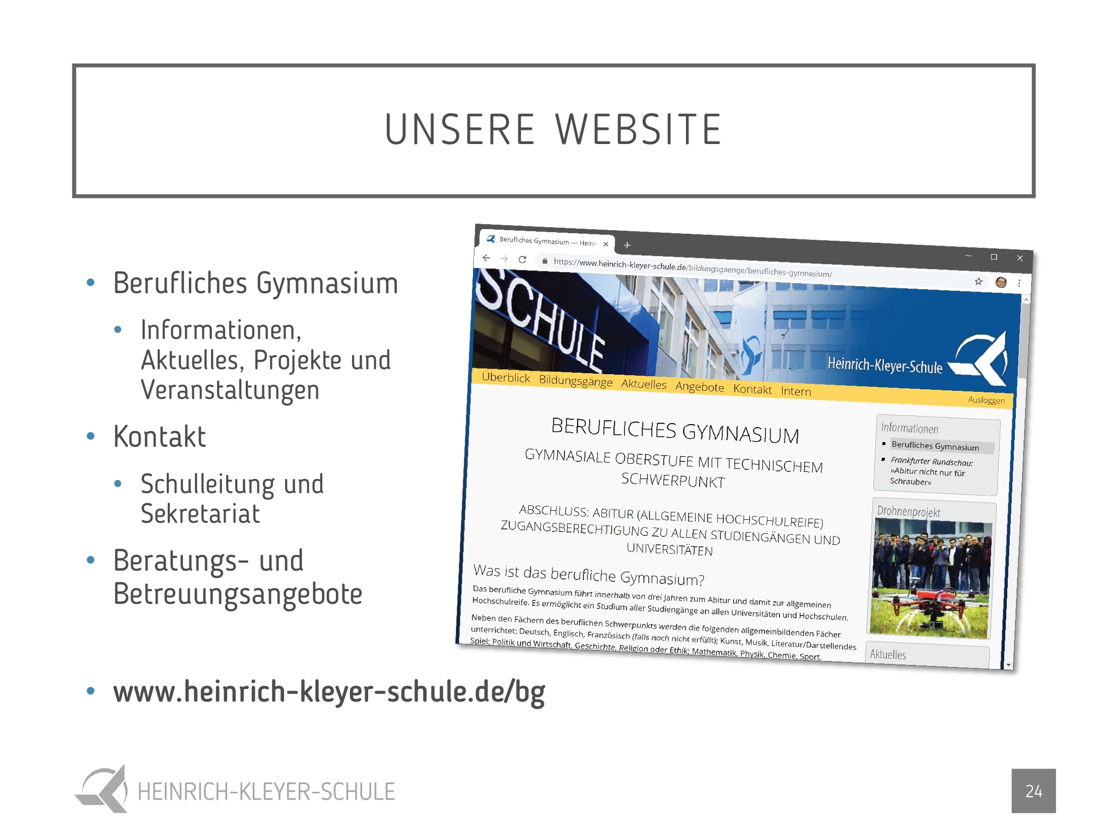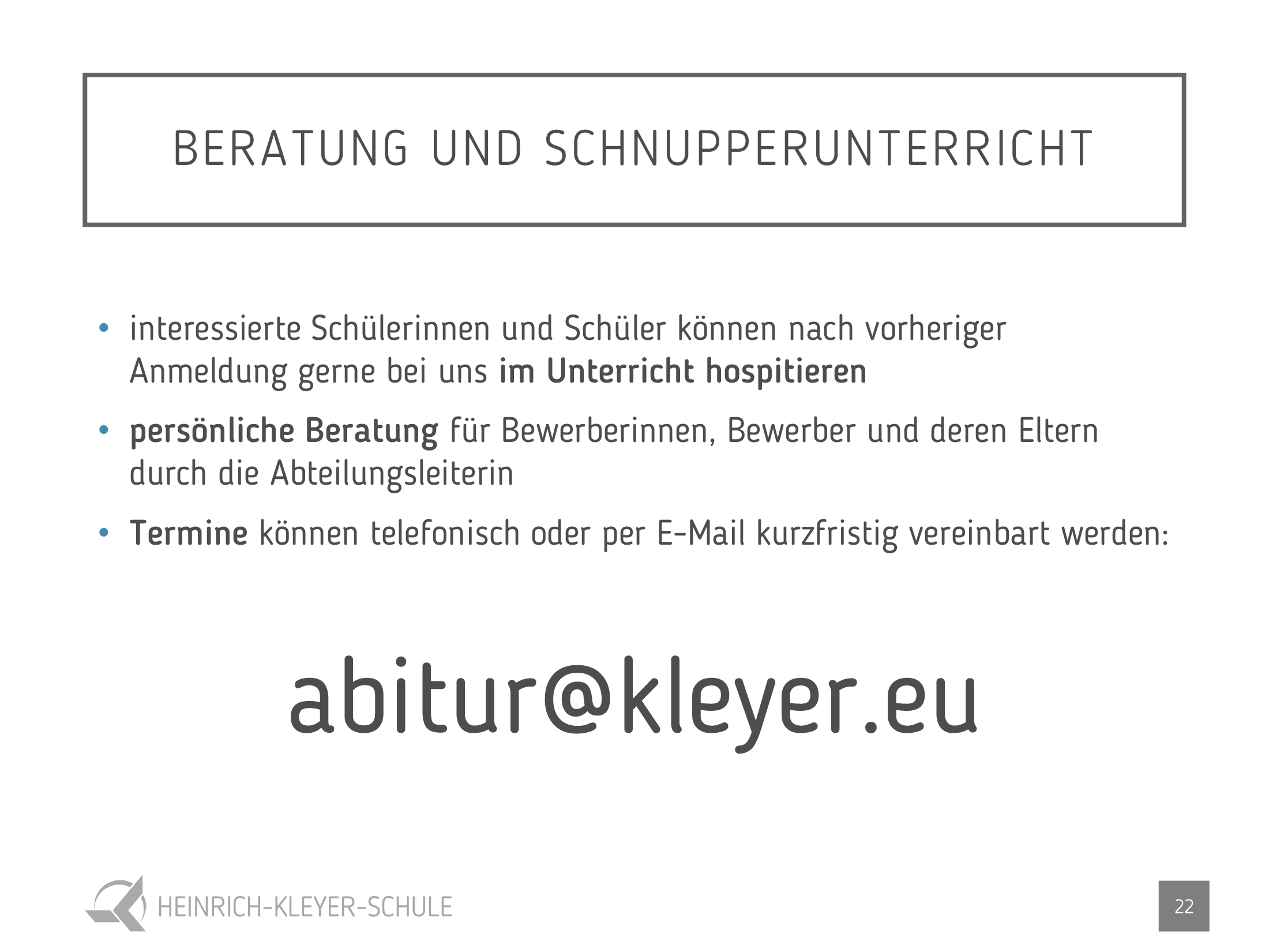 Wir laden Sie herzlich zu unserem Infotag im November und zum Infoabend im Januar ein. Genaue Daten und Uhrzeiten erfahren Sie unter www.heinrich-kleyer-schule.de/bg . Interessierte Schülerinnen und Schüler können nach vorheriger Terminvereinbarung gerne bei uns im Unterricht hospitieren.