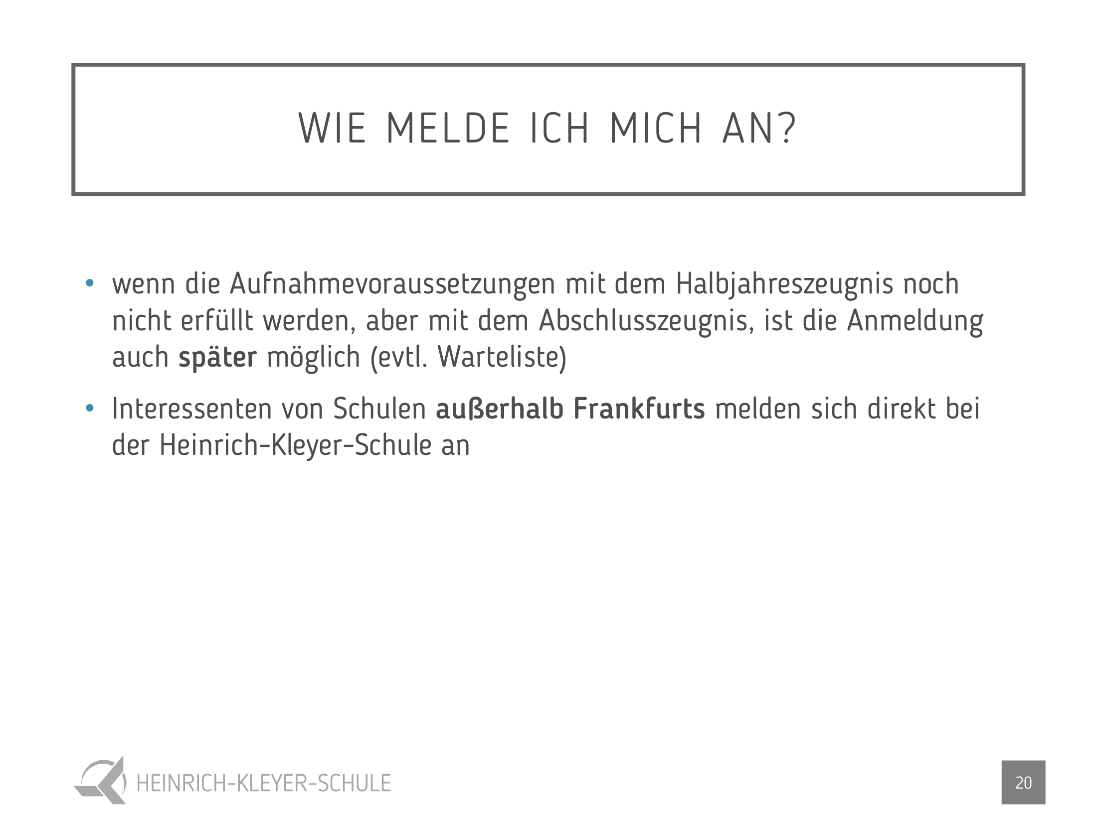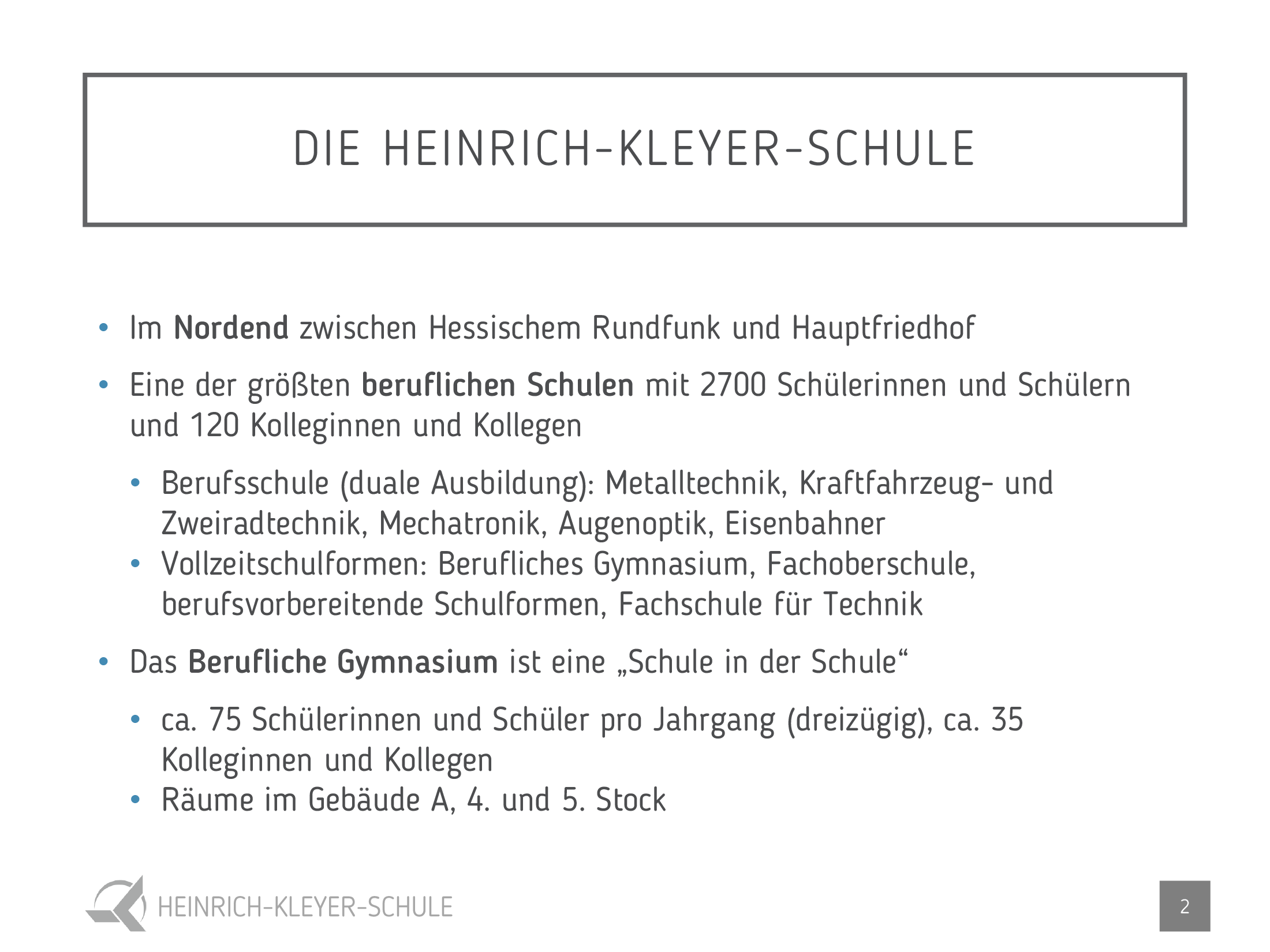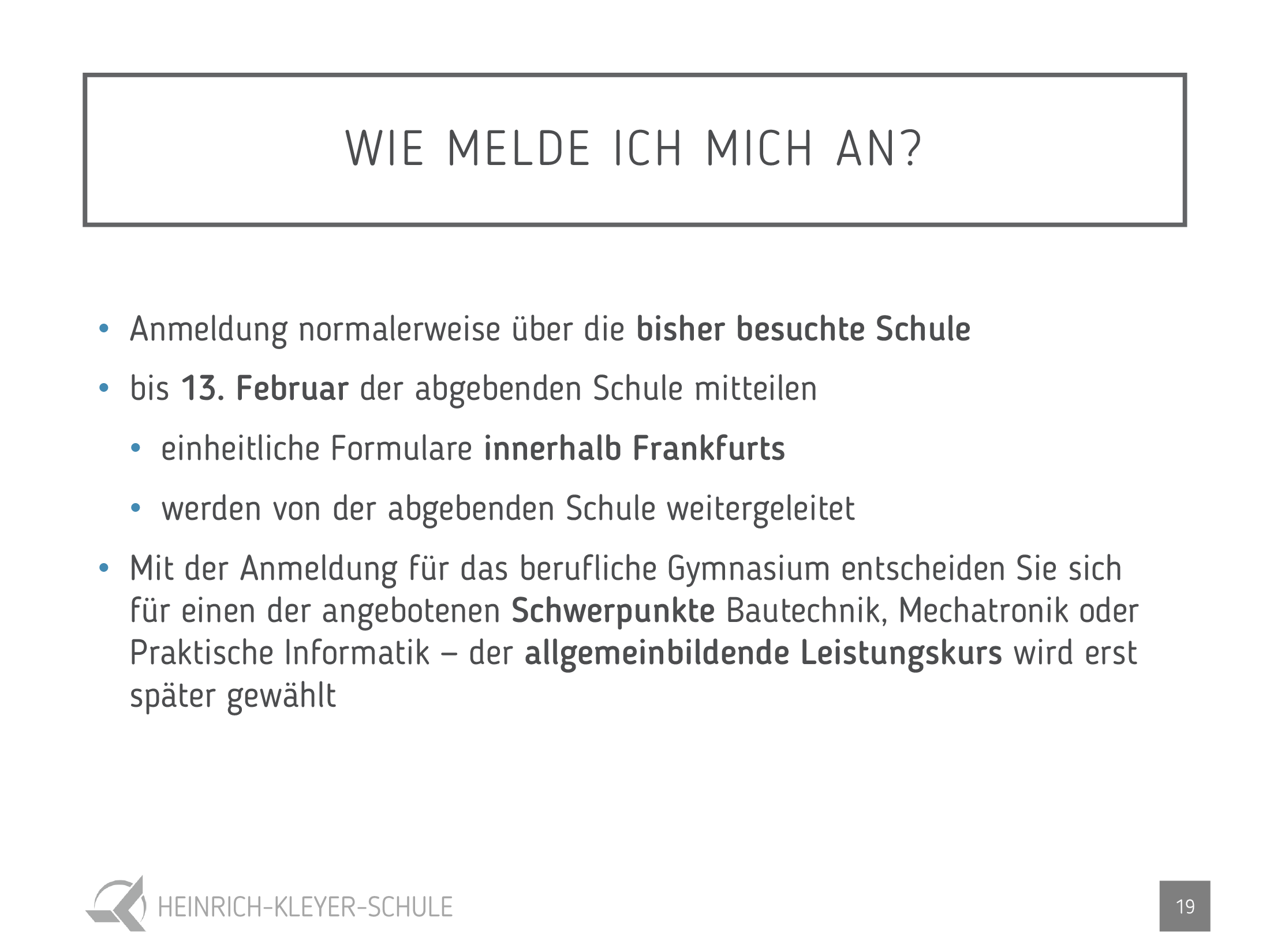 Wir laden Sie herzlich zu unserem Infotag im November und zum Infoabend im Januar ein. Genaue Daten und Uhrzeiten erfahren Sie unter www.heinrich-kleyer-schule.de/bg . Interessierte Schülerinnen und Schüler können nach vorheriger Terminvereinbarung gerne bei uns im Unterricht hospitieren.