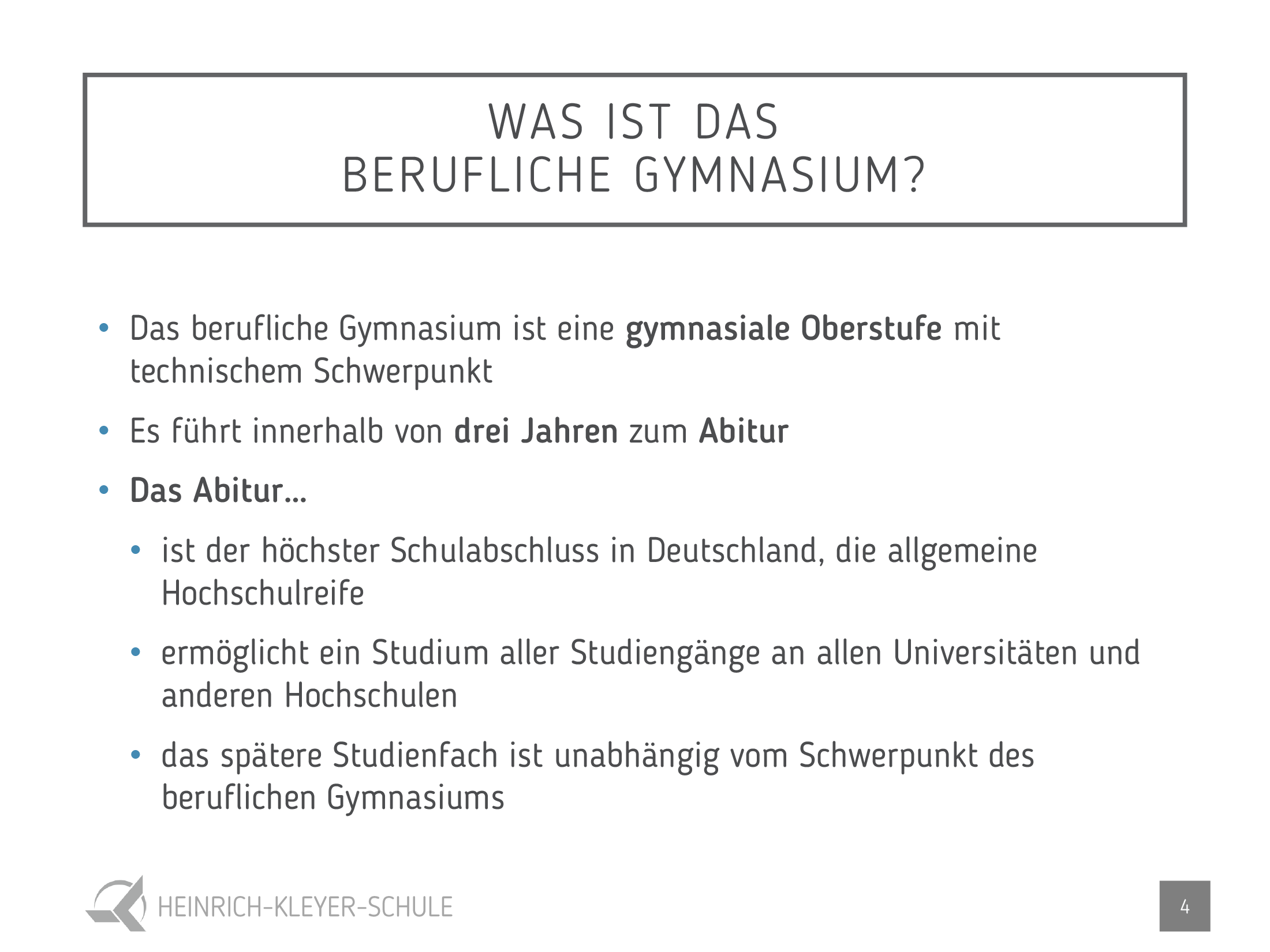 Das berufliche Gymnasium führt innerhalb von drei Jahren zum Abitur und damit zur allgemeinen Hochschulreife. Es ermöglicht ein Studium aller Studiengänge an allen Universitäten und Hochschulen.