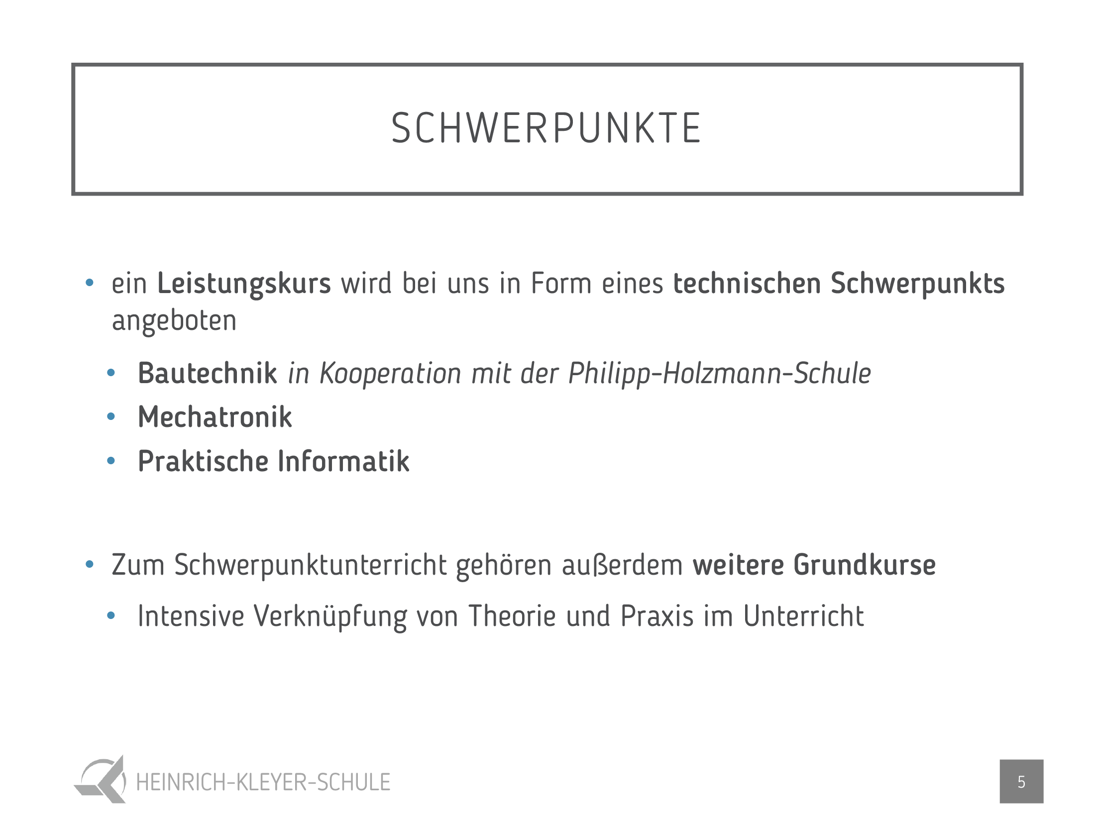 Der wesentliche Unterschied zur allgemeinen gymnasialen Oberstufe besteht darin, dass das zweite Leistungsfach bei uns in Form eines technischen Schwerpunkts angeboten wird.