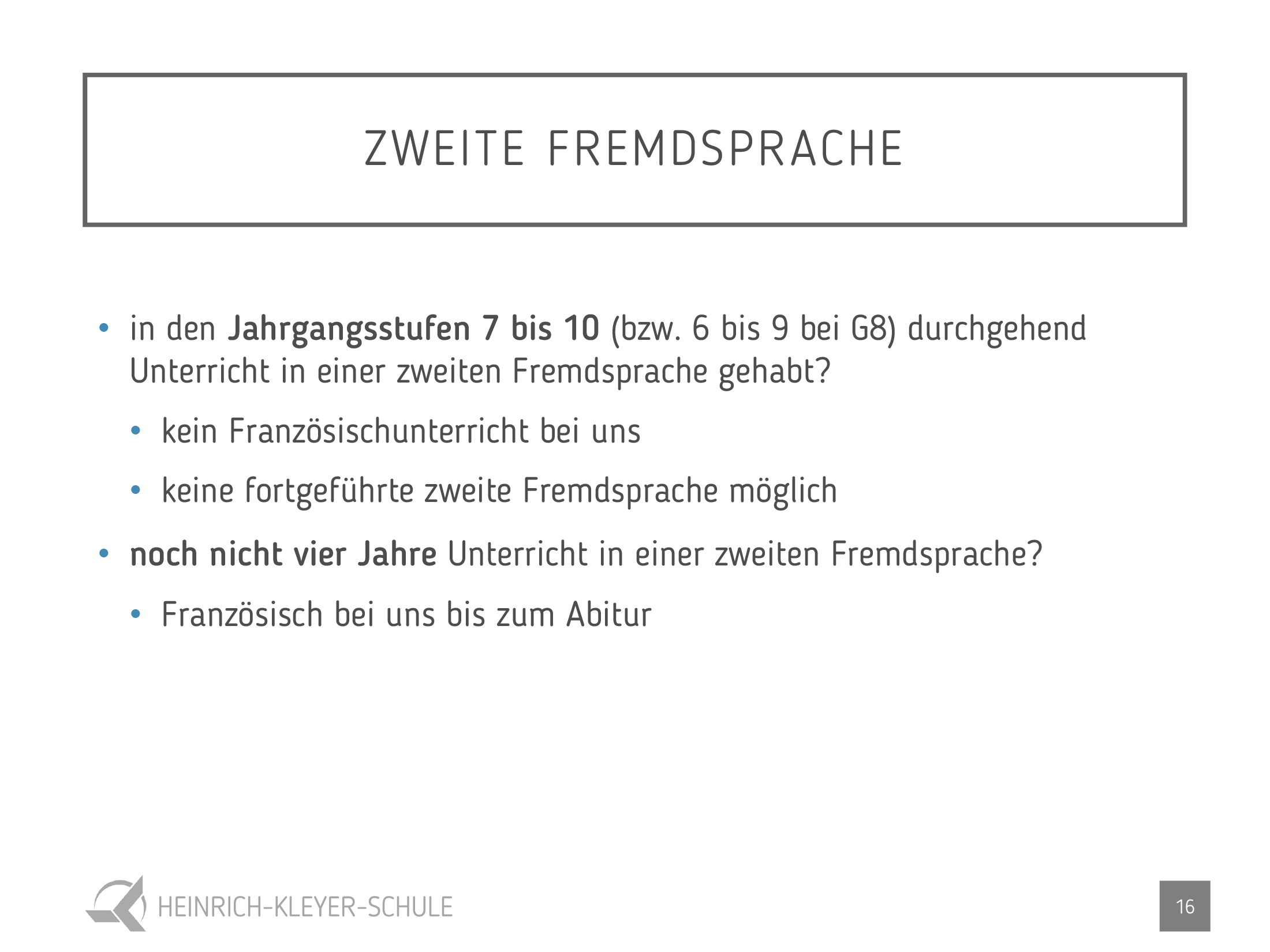 - Wer in den Jahrgangsstufen 7 bis 10 (bzw. 6 bis 9 bei G8) durchgehend in einer zweiten Fremdsprache unterrichtet wurde, ist nicht mehr verpflichtet, am Französischunterricht teilzunehmen.