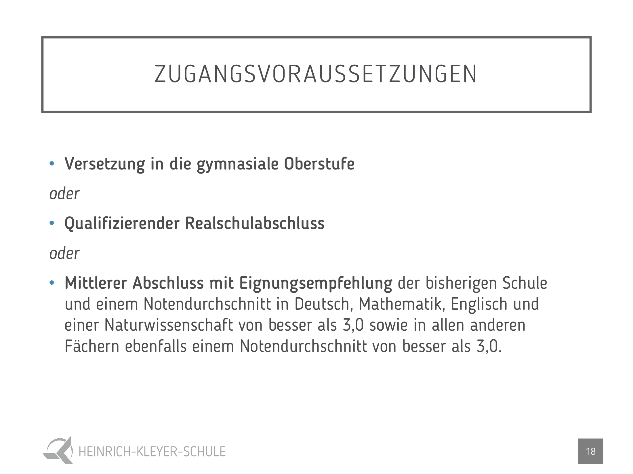- Mittlerer Abschluss mit Eignungsempfehlung der bisherigen Schule und einem Notendurchschnitt in Deutsch, Mathematik, Englisch und einer Naturwissenschaft von besser als 3,0 sowie in allen anderen Fächern ebenfalls einem Notendurchschnitt von besser als 3,0.